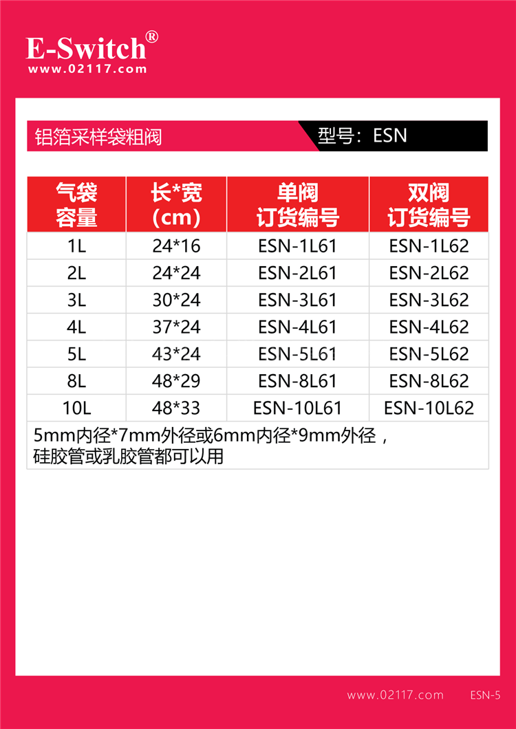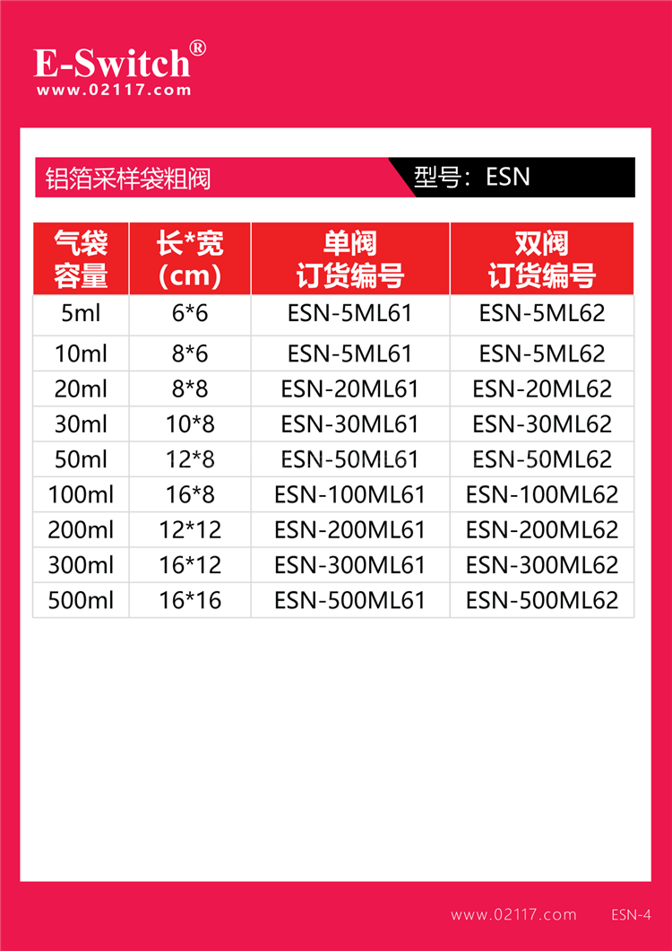2024-12-24 17:05:47 来源:www02117com E-SWITCH品牌铝箔气体采样袋容量参考尺寸表(袋子尺寸在每批发货时,可能尺寸有部分变动,以实际发货尺寸为准):